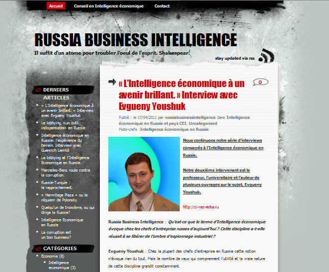 С просьбой об интервью ко мне обратилась коллега из Франции Евгения Антонини (Génia Antonini). Попросила ответить на ряд вопросов о конкурентной разведке в России. Материал на французском языке можно увидеть в ее блоге Russia Business Intelligence.